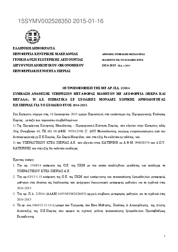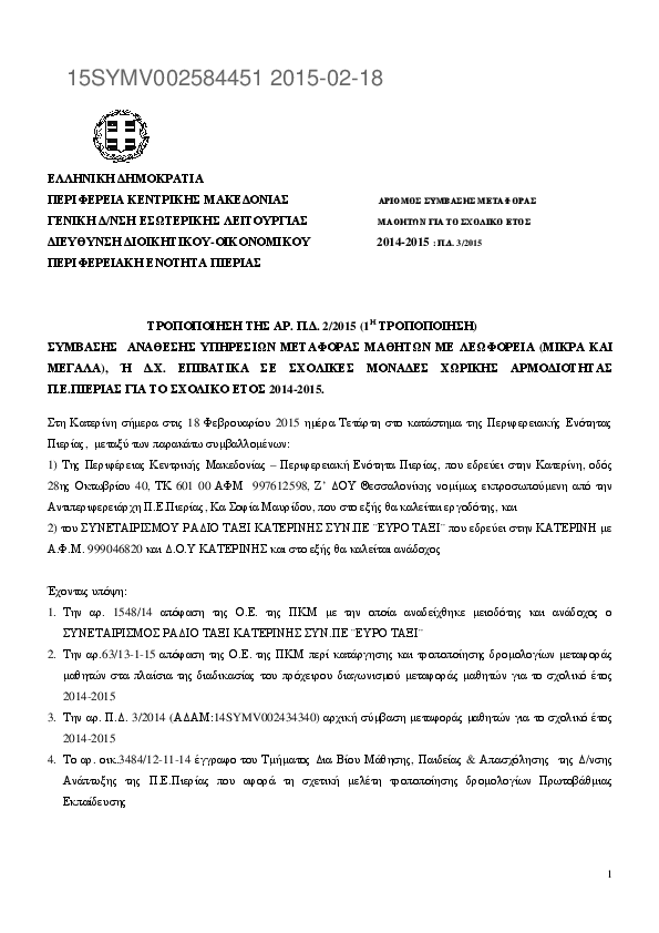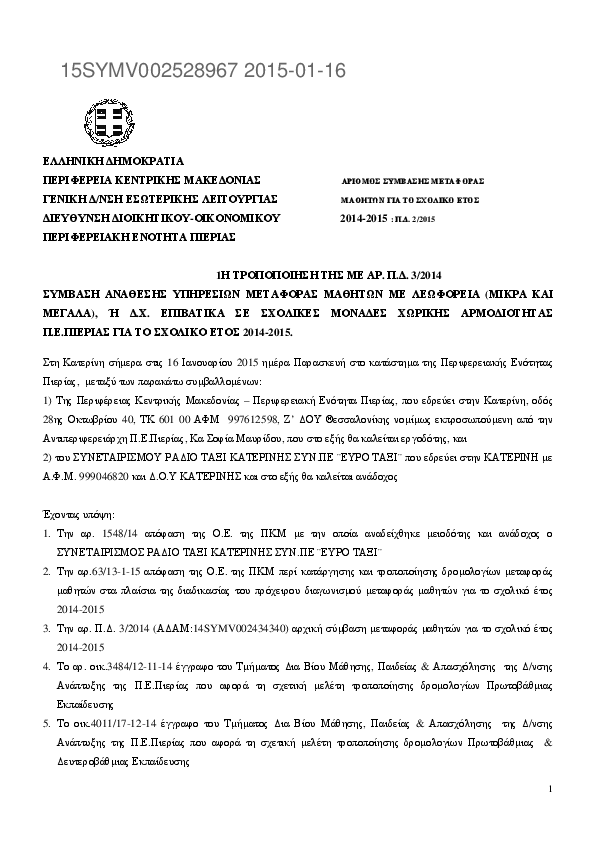 3. 1τροποποίηση της αρ. ΠΔ3/2014 σύμβασης αναθεσης μεταφοράς μαθητών χωρ.αρ. ΠΕ Πιερίας 2014-2015