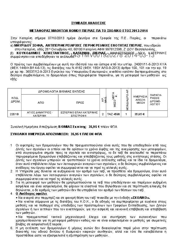 8. ΣΥΜΒΑΣΗΣ ΑΝΑΘΕΣΗΣ ΜΕΤΑΦΟΡΑΣ ΜΑΘΗΤΩΝ ΝΟΜΟΥ ΠΙΕΡΙΑΣ ΓΙΑ ΤΟ ΣΧΟΛΙΚΟ ΕΤΟΣ 2013-2014