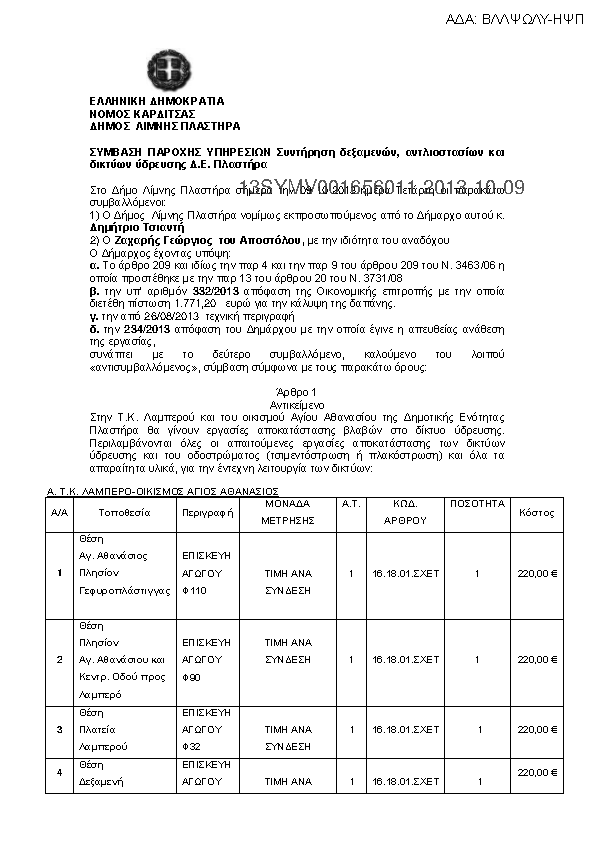 3. Συντήρηση δεξαμενών, αντλιοστασίων και δικτύων ύδρευσης Δ.Ε. Πλαστήρα