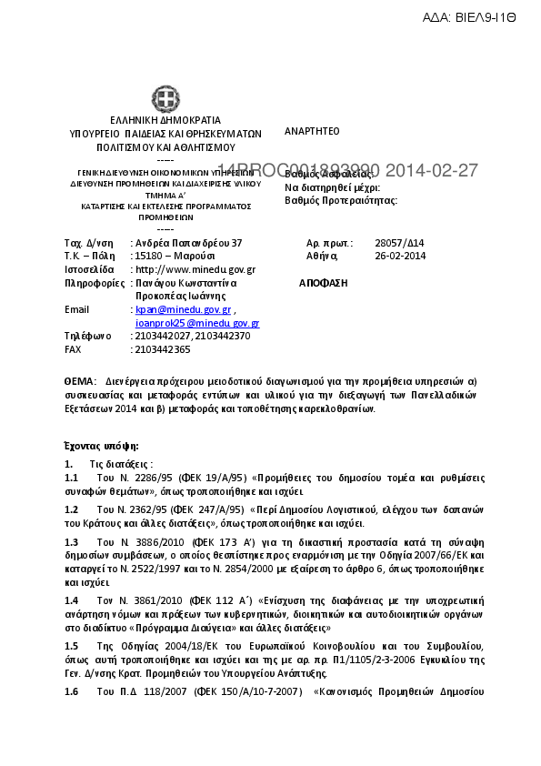 3. Διενέργεια πρόχειρου μειοδοτικού διαγωνισμού για την προμήθεια υπηρεσιών α) συσκευασίας και μεταφοράς εντύπων και υλικού για την διεξαγωγή των Πανελλαδικών Εξετάσεων 2014 και β) μεταφοράς και τοποθέτησης καρεκλοθρανίων.