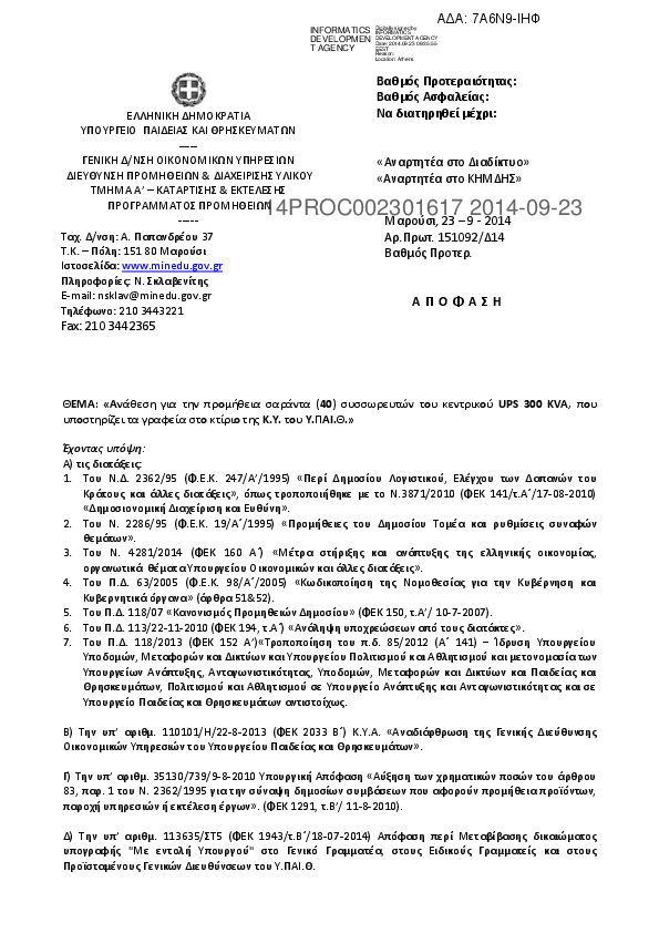 5. Ανάθεση για την προμήθεια σαράντα (40) συσσωρευτών του κεντρικού UPS 300 KVA, που υποστηρίζει τα γρα