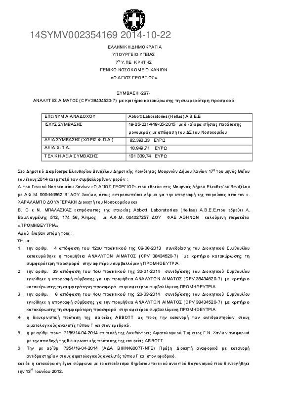 8. ΣΥΜΒΑΣΗ -267- ΑΝΑΛΥΤΕΣ ΑΙΜΑΤΟΣ (CPV 38434520-7) με κριτήριο κατακύρωσης τη συμφερότερη προσφορά