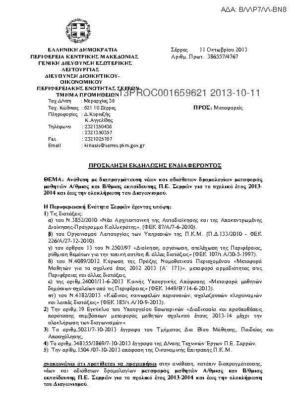 1. Ανάθεση με διαπραγμάτευση νέων και αδιάθετων δρομολογίων μεταφοράς μαθητών Α/θμιας και Β/θμιας εκπαίδευσης Π.Ε. Σερρών για το σχολικό έτος 2013