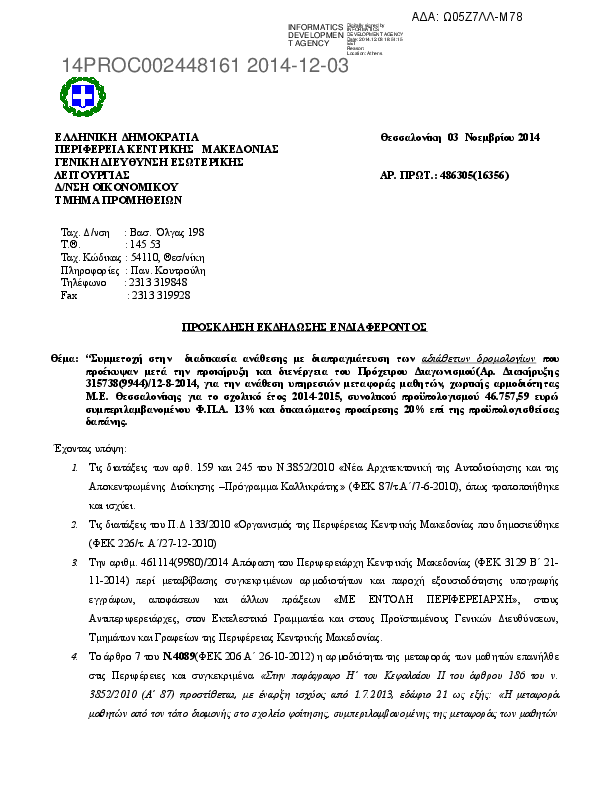 2. Διακήρυξη πρόχειρου, επαναληπτικού, ανοικτού διαγωνισμού για μεταφορά μαθητών 2014-15 Π.Ε. Ημαθίας