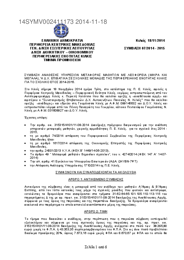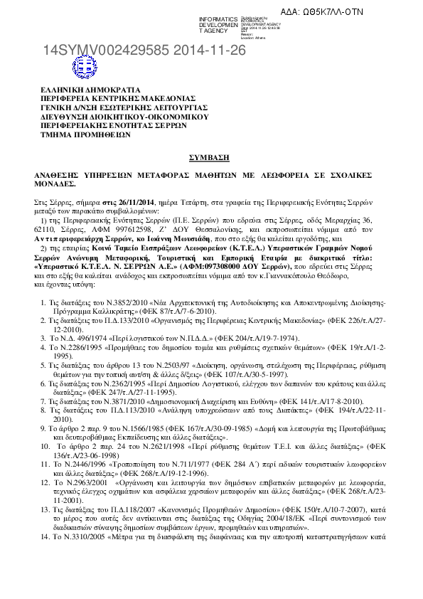10. ΣΥΜΒΑΣΗ ΠΡΟΧΕΙΡΟΥ ΔΙΑΓΩΝΙΣΜΟΥ ΜΕΤΑΦΟΡΑΣ ΜΑΘΗΤΩΝ ΓΙΑ ΤΟ ΣΧΟΛΙΚΟ ΕΤΟΣ 2014-2015