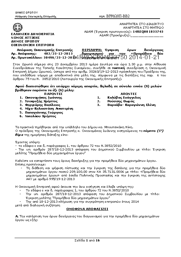 7. ΑΠΟΦΑΣΗ ΟΙΚΟΝΟΜΙΚΗΣ 402/2013 Έγκριση όρων διενέργειας διαγωνισμού για την "Προμήθεια δύο μηχανημάτων έργου"