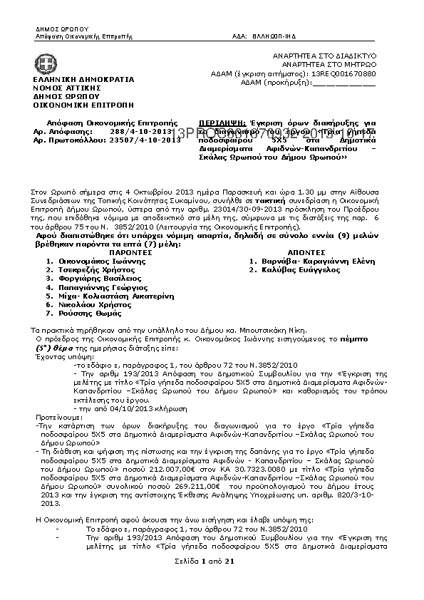 9. ΑΠΟΦΑΣΗ ΟΙΚΟΝΟΜΙΚΗΣ ΕΠΙΤΡΟΠΗΣ 288/2013: Έγκριση όρων διακήρυξης για το διαγωνισμό του έργου «Τρία γήπεδα ποδοσφαίρου 5Χ5 στα Δημοτικά Διαμερίσματα Αφιδνών