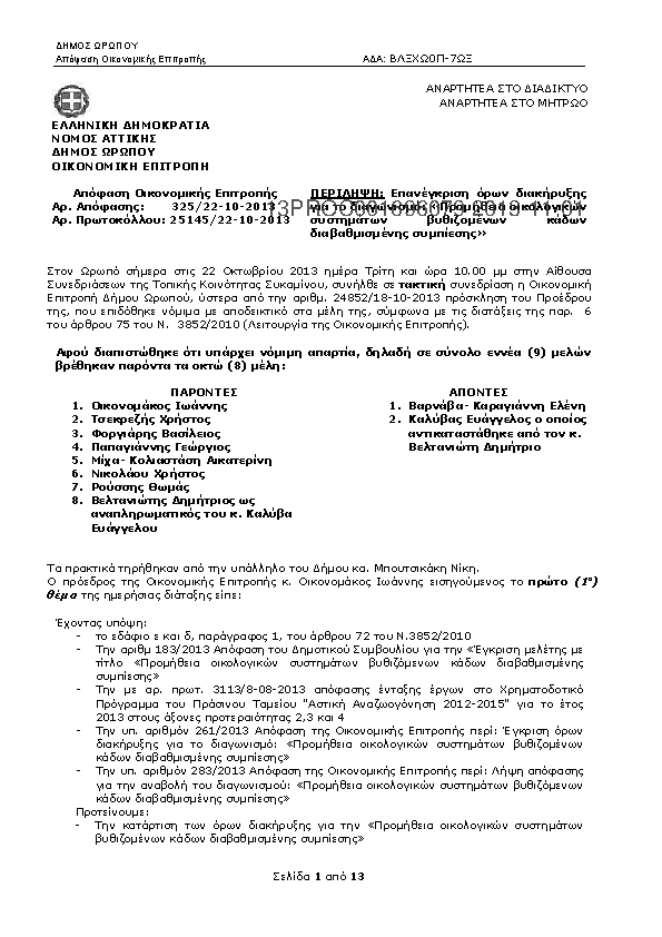 8. ΑΠΟΦΑΣΗ ΟΙΚΟΝΟΜΙΚΗΣ ΕΠΙΤΡΟΠΗΣ 325/2013: Επανέγκριση όρων διακήρυξης για το διαγωνισμό: «Προμήθεια οικολογικών συστημάτων βυθιζομένων κάδων διαβαθμισμένης συμπίεσης»