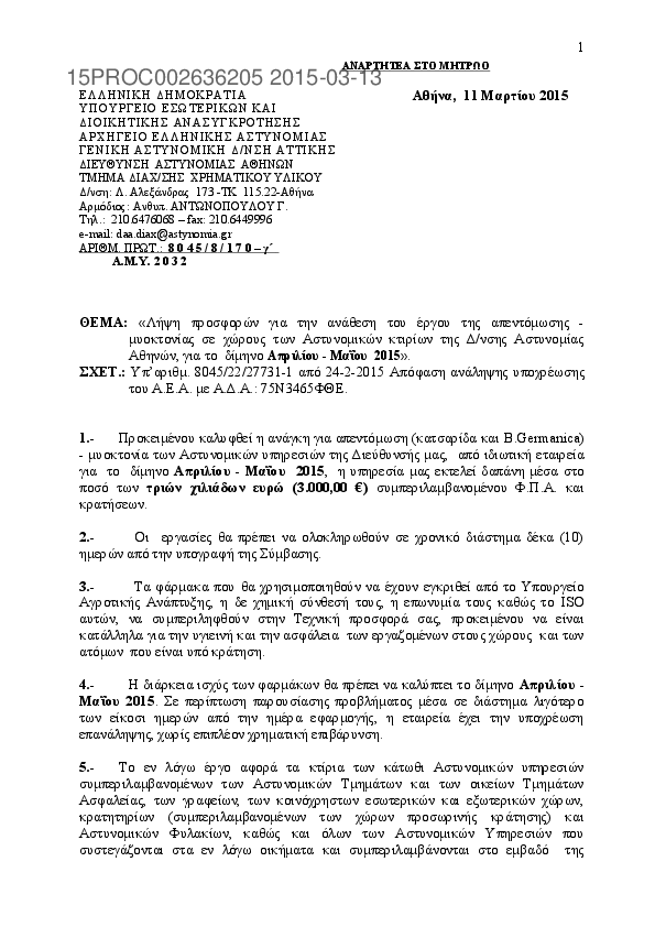7. ΠΡΟΣΚΛΗΣΗ ΕΝΔΙΑΦΕΡΟΝΤΟΣ ΓΙΑ ΤΗΝ ΑΝΑΘΕΣΗ ΕΡΓΟΥ ΑΠΕΝΤΟΜΩΣΗΣ ΜΥΟΚΤΟΝΙΑΣ ΣΕ ΧΩΡΟΥΣ ΤΩΝ ΑΣΤΥΝΟΜΙΚΩΝ ΚΤΙΡΙΩΝ ΤΗΣ Δ/ΝΣΗΣ ΑΣΤΥΝΟΜΙΑΣ ΑΘΗΝΩΝ ΓΙΑ ΤΟ ΔΙΜΗΝΟ ΑΠΡΙΛΙΟΥ ΜΑΙΟΥ 2015