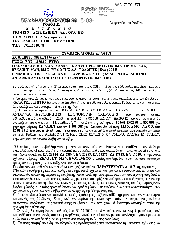 10. Σύμβαση προμήθειας ανταλλακτικών υπηρεσιακών οχημάτων της Δ.Α. Ροδόπης(ΕΤΟΥΣ 2015)