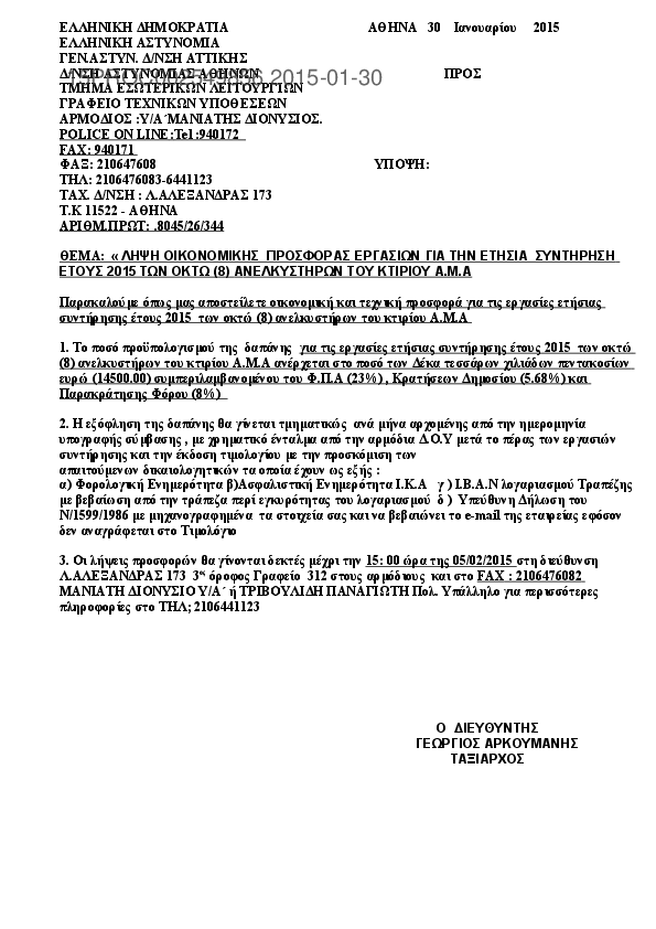 8. ΑΜΟΙΒΗ ΕΡΓΑΣΙΩΝ ΕΤΗΣΙΑΣ ΣΥΝΤΗΡΗΣΗΣ ΕΤΟΥΣ 2015 ΟΚΤΩ ΑΝΕΛΚΥΣΤΗΡΩΝ ΤΟΥΚΤΙΡΙΟΥ Α.Μ.Α