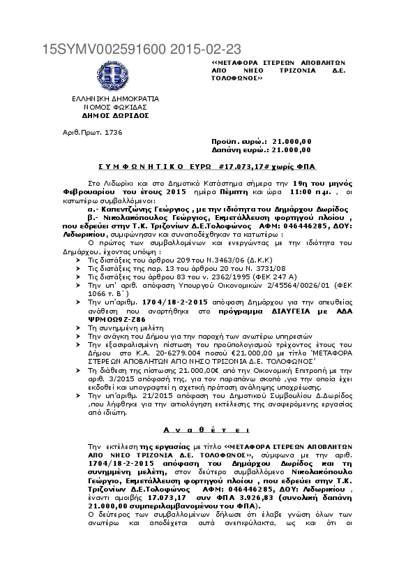 3. ΜΕΤΑΦΟΡΑ ΣΤΕΡΕΩΝ ΑΠΟΒΛΗΤΩΝ ΑΠΟ ΝΗΣΟ ΤΡΙΖΟΝΙΑ Δ.Ε. ΤΟΛΟΦΩΝΟΣ