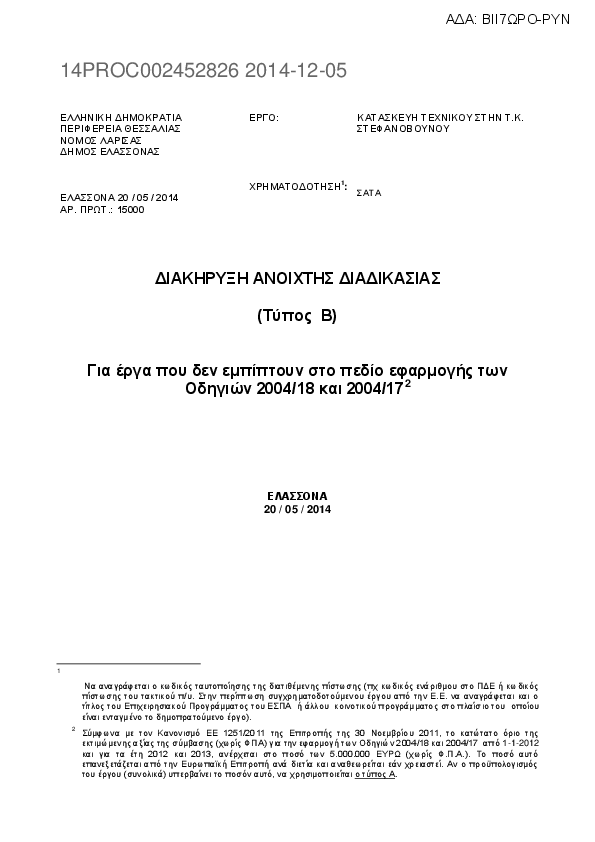 9. Διακήρυξη ανοιχτής δημοπρασίας για την κατασκευή του έργου: ΚΑΤΑΣΚΕΥΗ ΤΕΧΝΙΚΟΥ ΣΤΗΝ Τ. Κ. ΣΤΕΦΑΝΟΒΟΥΝΟΥ