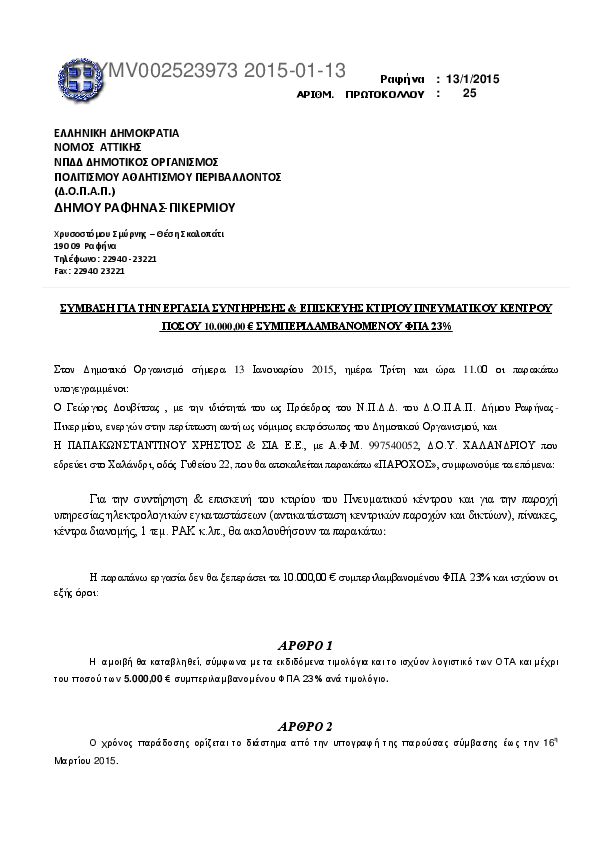 10. ΣΥΜΒΑΣΗ ΓΙΑ ΤΗΝ ΕΡΓΑΣΙΑ ΣΥΝΤΗΡΗΣΗΣ & ΕΠΙΣΚΕΥΗΣ ΚΤΙΡΙΟΥ ΠΝΕΥΜΑΤΙΚΟΥ ΚΕΝΤΡΟΥ
