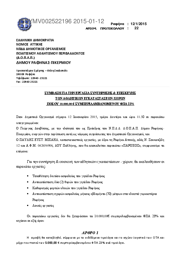 2. ΣΥΜΒΑΣΗ ΓΙΑ ΤΗΝ ΤΑΚΤΟΠΟΙΗΣΗ ΤΩΝ ΚΤΙΣΜΑΤΩΝ ΚΑΙ ΑΘΛΗΤΙΚΩΝ ΕΓΚΑΤΑΣΤΑΣΕΩΝ ΣΤΗΝ ΘΕΣΗ ΛΟΦΟΣ ΟΧΥΡΟΥ ΡΑΦΗΝΑΣ