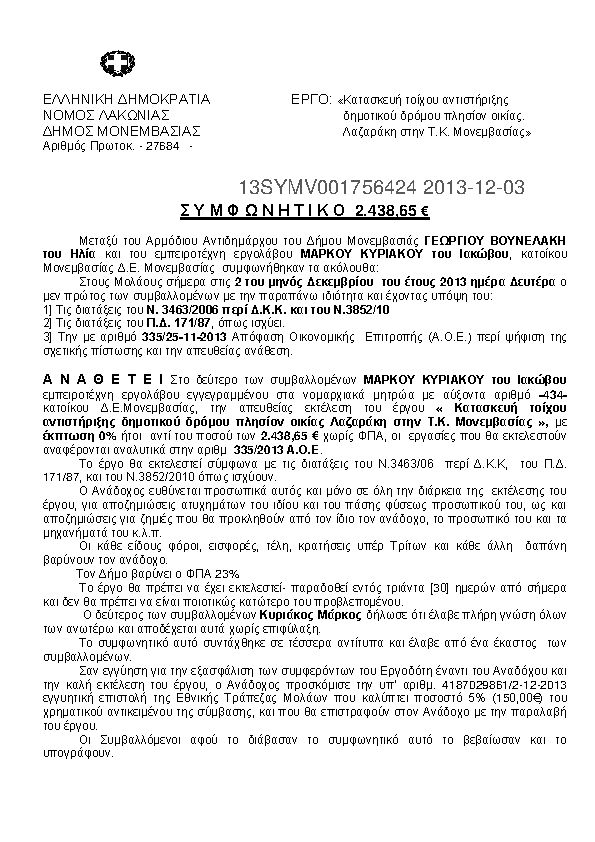 2. ΚΑΤΑΣΚΕΥΗ ΤΟΙΧΟΥ ΑΝΤΙΣΤΗΡΙΞΗΣ ΔΗΜΟΤΙΚΟΥ ΔΡΟΜΟΥ ΠΛΗΣΙΟΝ ΟΙΚΙΑΣ ΛΑΖΑΡΑΚΗ ΣΤΗΝ ΤΚ ΜΟΝΕΜΒΑΣΙΑΣ