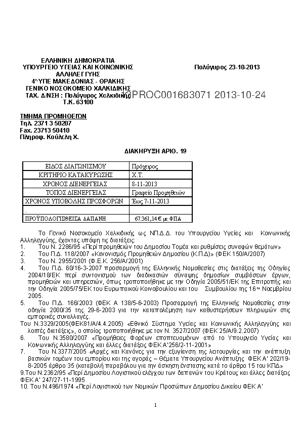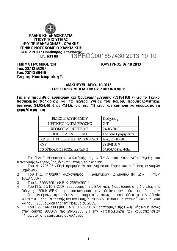 5. ΔΙΑΚΗΡΥΞΗ ΑΡΙΘΜ. 18/2013 ΤΟΥ ΠΡΟΧΕΙΡΟΥ ΜΕΙΟΔΟΤΙΚΟΥ ΔΙΑΓΩΝΙΣΜΟΥ ΓΙΑ ΤΗΝ ΠΡΟΜΗΘΕΙΑ ΣΥΣΚΕΥΩΝ ΚΑΙ ΟΡΓΑΝΩΝ ΕΓΧΥΣΗΣ (33194100