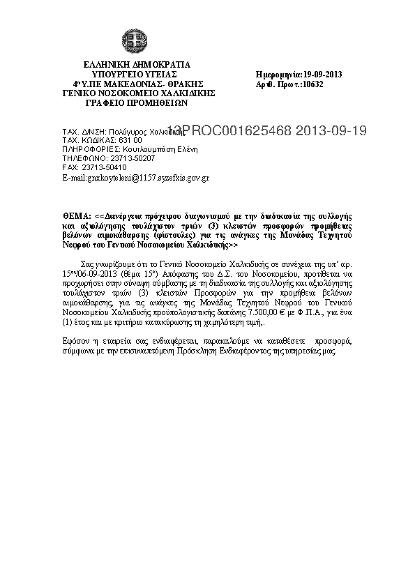 8. ΠΡΟΣΚΛΗΣΗ ΕΚΔΗΛΩΣΗΣ ΕΝΔΙΑΦΕΡΟΝΤΟΣ ΓΙΑ ΤΗΝ ΠΡΟΜΗΘΕΙΑ ΒΕΛΟΝΩΝ ΑΙΜΟΚΑΘΑΡΣΗΣ ΓΙΑ ΤΙΣ ΑΝΑΓΚΕΣ ΤΟΥ ΓΕΝΙΚΟΥ ΝΟΣΟΚΟΜΕΙΟΥ ΧΑΛΚΙΔΙΚΗΣ ΓΙΑ ΕΝΑ (1) ΕΤΟΣ, ΠΡΟΫΠΟΛΟΓΙΣΤΙΚΗΣ ΔΑΠΑΝΗΣ 7.500,00 € ΜΕ Φ.Π.Α. ΚΑΙ ΚΡΙΤΗΡΙΟ ΚΑΤΑΚΥΡΩΣΗΣ ΤΗ ΧΑΜΗΛΟΤΕΡΗ ΤΙΜΗ