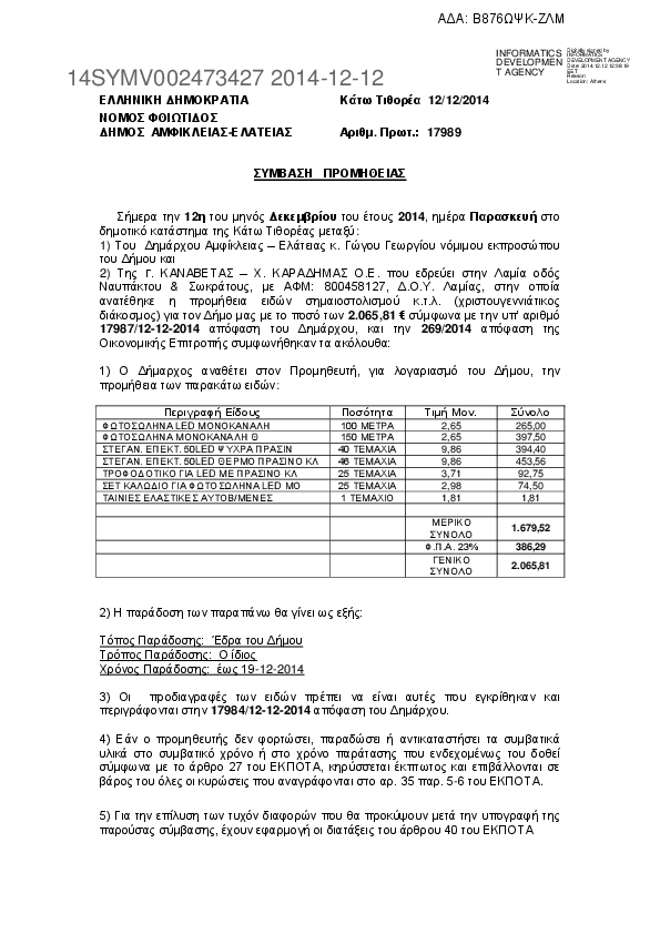 1. ΣΥΜΒΑΣΗ ΠΡΟΜΗΘΕΙΑΣ ΕΙΔΩΝ ΣΗΜΑΙΟΣΤΟΛΙΣΜΟΥ (ΧΡΙΣΤΟΥΓΕΝΝΙΑΤΙΚΟΣ ΔΙΑΚΟΣΜΟΣ)