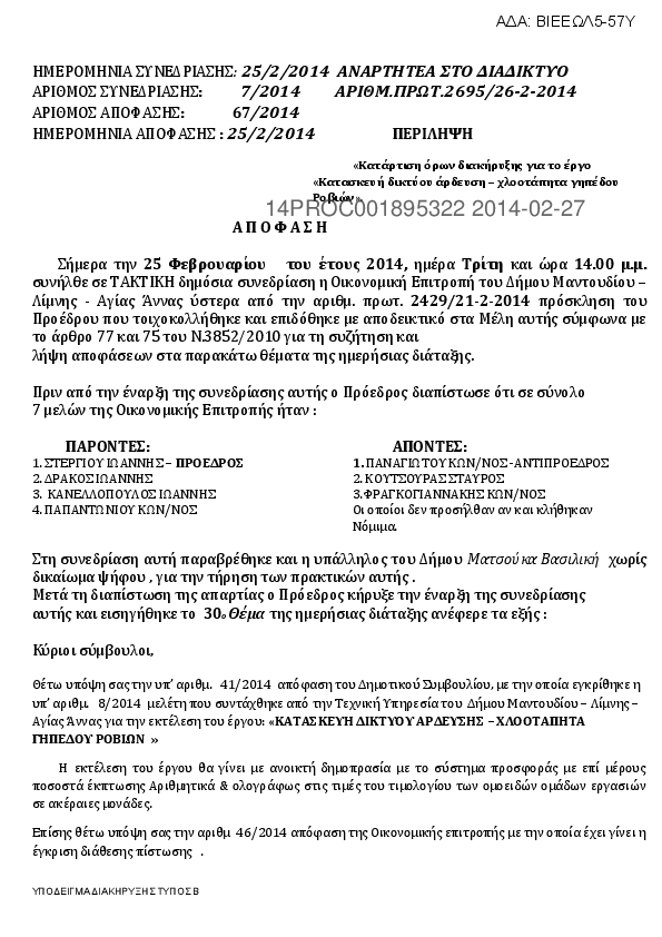 7. ΔΙΑΚΗΡΥΞΗ ΓΙΑ ΤΟ ΕΡΓΟ '' ΟΔΟΠΟΙΙΑ ΝΕΡΟΤΡΙΒΙΑΣ, ΨΑΧΝΩΝ, ΚΥΠΑΡΙΣΣΙΟΥ, ΜΑΚΡΥΚΑΠΑΣ΄΄