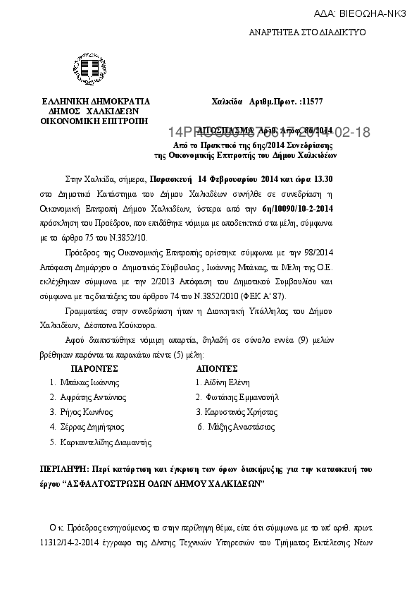 5. H 86/2014 απόφαση οικονομικής επιτροπής περί κατάρτιση και έγκριση των όρων διακήρυξης για την κατασκευή του έργου “ΑΣΦΑΛΤΟΣΤΡΩΣΗ ΟΔΩΝ ΔΗΜΟΥ ΧΑΛΚΙΔΕΩΝ”
