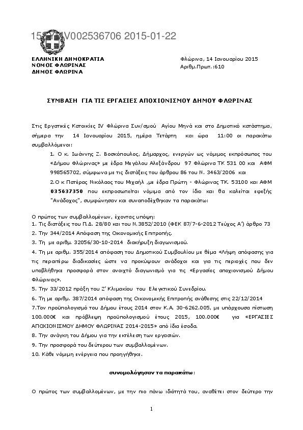 5. ΣΥΜΒΑΣΗ ΓΙΑ ΤΙΣ ΕΡΓΑΣΙΕΣ ΑΠΟΧΙΟΝΙΣΜΟΥ ΔΗΜΟΥ ΦΛΩΡΙΝΑΣ