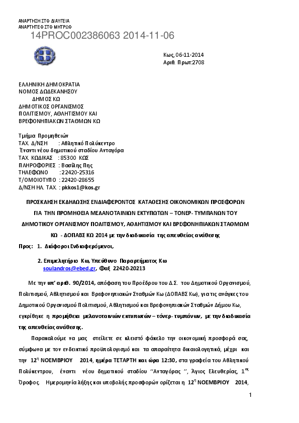 1. ΠΡΟΣΚΛΗΣΗ ΕΚΔΗΛΩΣΗΣ ΕΝΔΙΑΦΕΡΟΝΤΟΣ ΚΑΤΑΘΕΣΗΣ ΟΙΚΟΝΟΜΙΚΩΝ ΠΡΟΣΦΟΡΩΝ ΓΙΑ ΤΗΝ ΠΡΟΜΗΘΕΙΑ ΜΕΛΑΝΟΤΑΙΝΙΩΝ