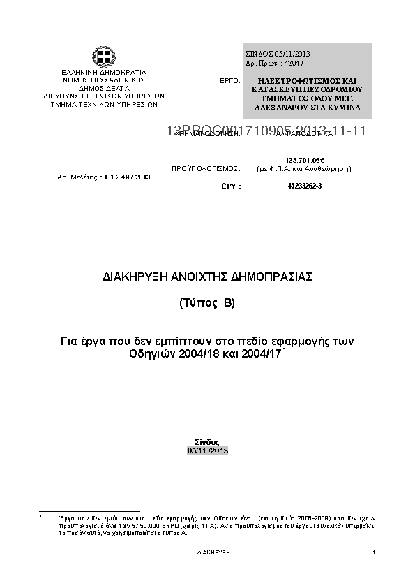 1. ΔΙΑΚΗΡΥΞΗ ΔΗΜΟΠΡΑΣΙΑΣ ΓΙΑ ΤΟ ΕΡΓΟ: "ΗΛΕΚΤΡΟΦΩΤΙΣΜΟΣ ΚΑΙ ΚΑΤΑΣΚΕΥΗ ΠΕΖΟΔΡΟΜΙΟΥ ΤΜΗΜΑΤΟΣ ΟΔΟΥ ΜΕΓ. ΑΛΕΞΑΝΔΡΟΥ ΣΤΑ ΚΥΜΙΝΑ"