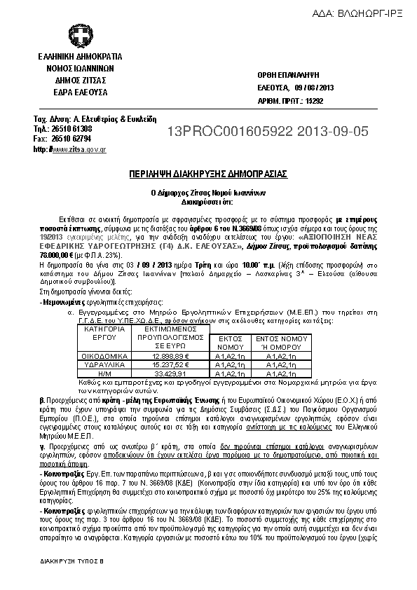 1. ΔΙΑΚΗΡΥΞΗ ΔΗΜΟΠΡΑΣΙΑΣ ΓΙΑ ΤΟ ΕΡΓΟ "ΑΞΙΟΠΟΙΗΣΗ ΝΕΑΣ ΕΦΕΔΡΙΚΗΣ ΥΔΡΟΓΕΩΤΡΗΣΗΣ (Γ4) Δ.Κ. ΕΛΕΟΥΣΑΣ», Δήμου Ζίτσας, προϋπολογισμού δαπάνης 78.000,00 € (με Φ.Π.Α. 23%).