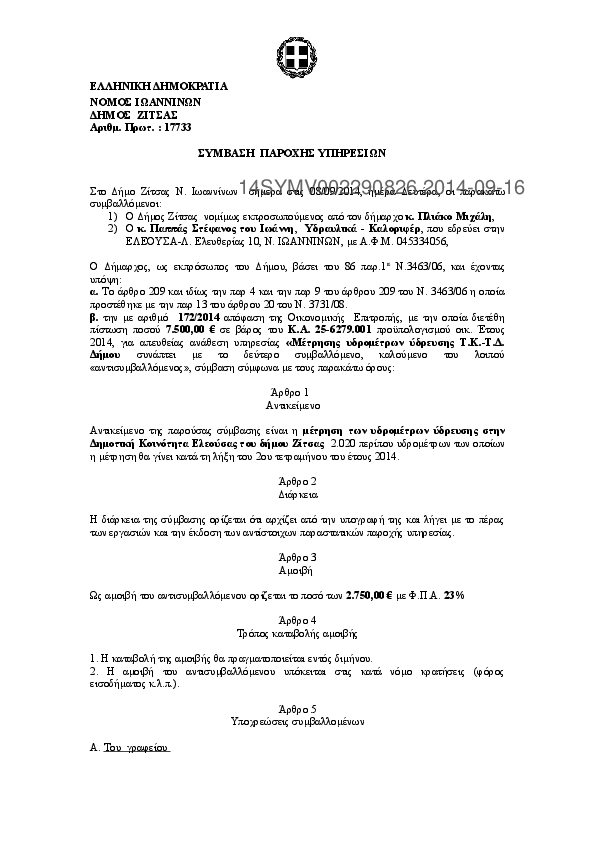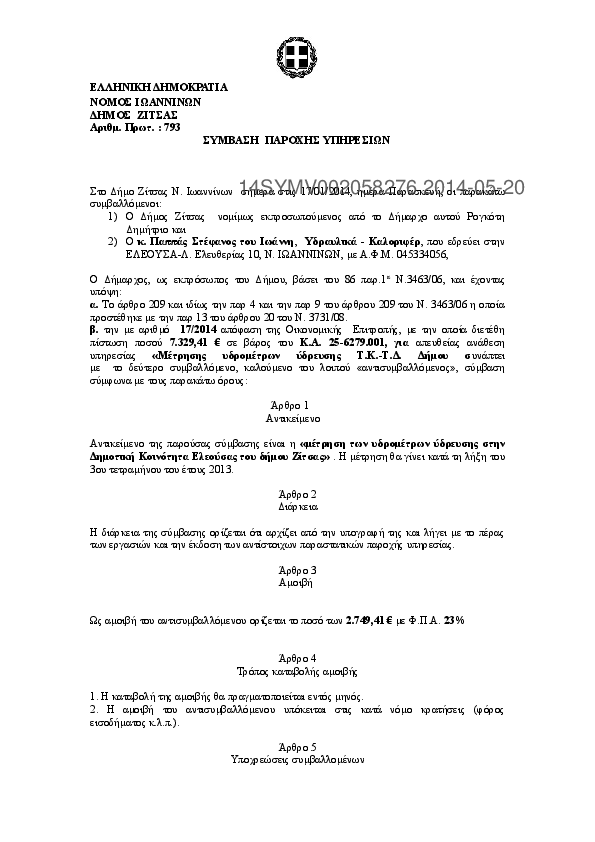 3. Μέτρηση υδρομέτρων δικτύου ύδρευσης Τ.Κ.-Δ.Κ. Δήμου Ζίτσας για το 1ο τετράμηνο του 2014