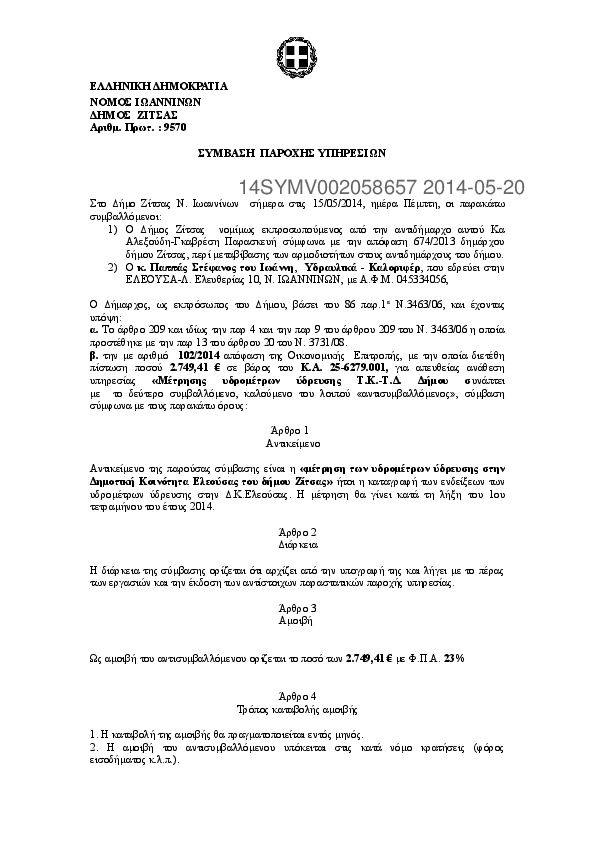 4. Μέτρηση υδρομέτρων δικτύου ύδρευσης Τ.Κ.-Δ.Κ. Δήμου Ζίτσας για το 1ο τετράμηνο του 2014