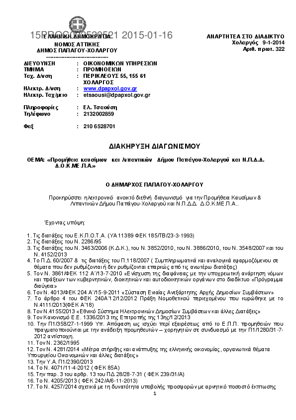 1. ΔΙΑΚΗΡΥΞΗ ΔΙΑΓΩΝΙΣΜΟΥ ΠΡΟΜΗΘΕΙΑΣ ΚΑΥΣΙΜΩΝ ΚΑΙ ΛΙΠΑΝΤΙΚΩΝ ΔΗΜΟΥ ΠΑΠΑΓΟΥ-ΧΟΛΑΡΓΟΥ ΚΑΙ ΝΠΔΔ ΔΟΚΜΕΠΑ