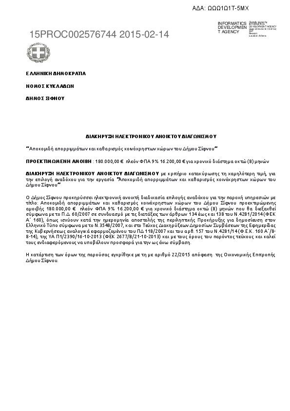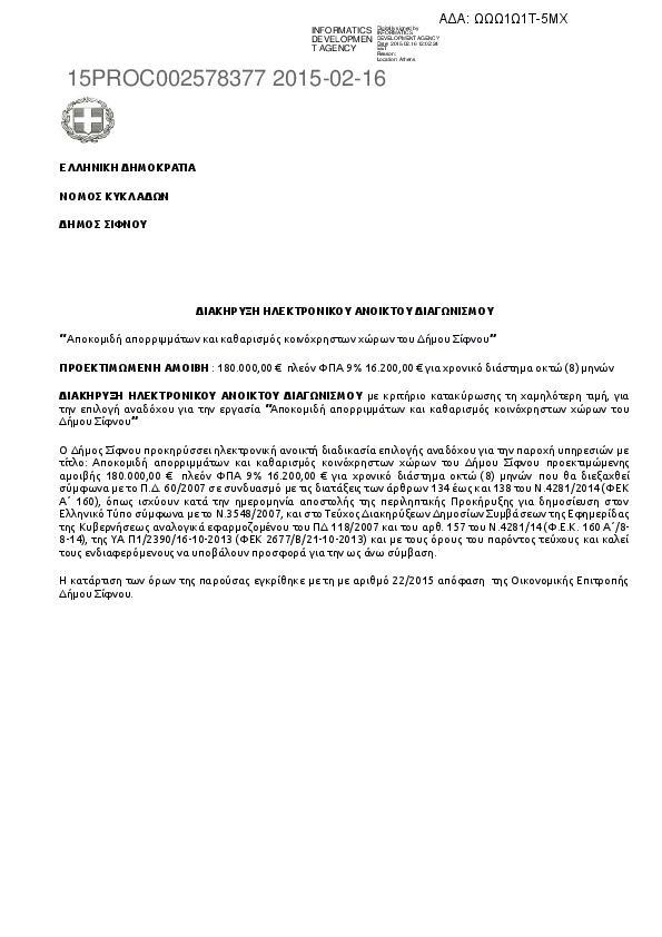 1. ΔΙΑΚΗΡΥΞΗ ΑΝΟΙΚΤΟΥ ΗΛΕΚΤΡΟΝΙΚΟΥ ΔΙΑΓΩΝΙΣΜΟΥ ΓΙΑ ΤΗΝ ΕΡΓΑΣΙΑ -ΑΠΟΚΟΜΙΔΗ ΑΠΟΡΡΙΜΜΑΤΩΝ ΚΑΙ ΚΑΘΑΡΙΣΜΟΣ ΚΟΙΝΟΧΡΗΣΤΩΝ ΧΩΡΩΝ ΤΟΥ ΔΗΜΟΥ ΣΙΦΝΟΥ-