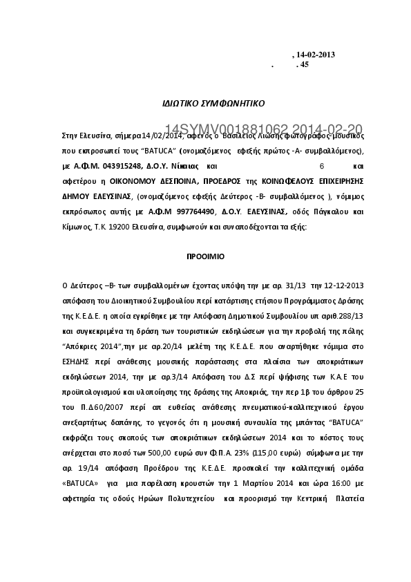 5. ΣΥΜΒΑΣΗ ΓΙΑ ΤΗΝ ΠΡΟΜΗΘΕΙΑ ΜΕΛΙΟΥ ΓΙΑ ΤΙΣ ΑΝΑΓΚΕΣ ΤΟΥ ΧΡΙΣΤΟΥΓΕΝΝΙΑΤΙΚΟΥ ΧΩΡΙΟΥ 2014.