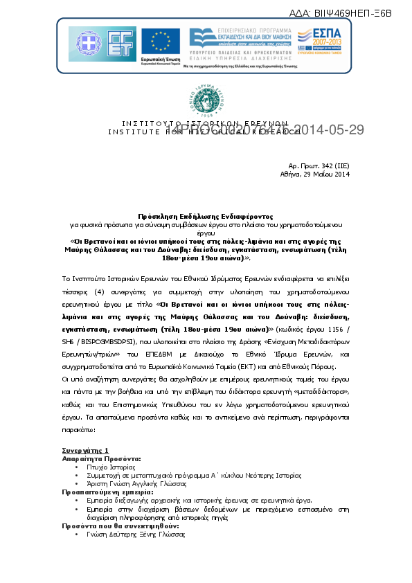 9. Πρόσκληση Εκδήλωσης Ενδιαφέροντος για φυσικά πρόσωπα για σύναψη συμβάσεων έργου στο πλαίσιο του χρηματοδοτούμενου έργου «Οι Βρετανοί και οι ιόνιοι υπήκοοί τους στις πόλεις-λιμάνια και στις αγορές της Μαύρης Θάλασσας και του Δούναβη: διεί...