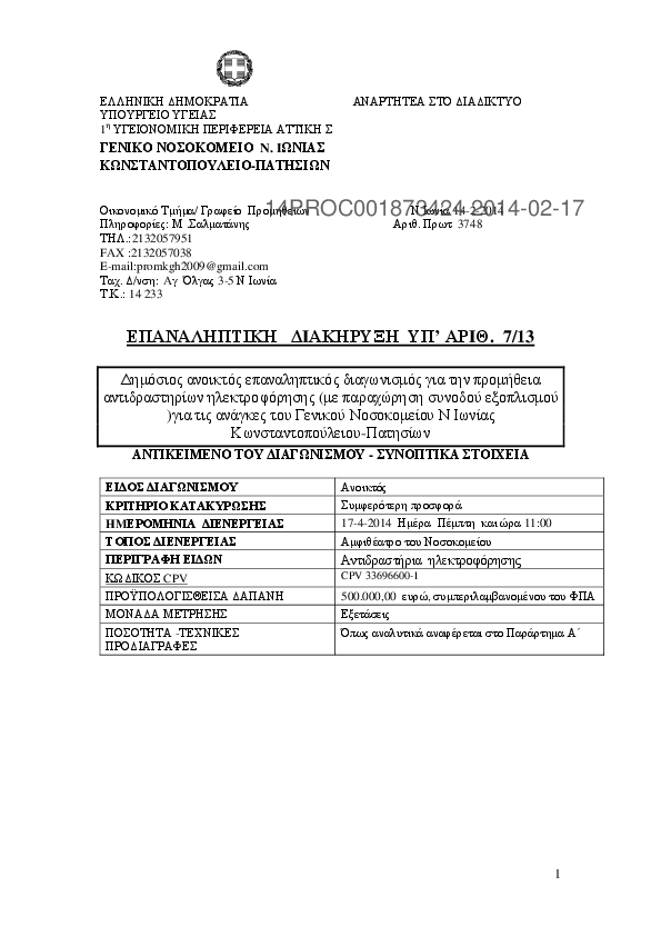 3. ΔIΑΚΗΡΥΞΗ ΥΠ’ ΑΡIΘ. 2/13Δημόσιος ανοικτός διαγωνισμός για την προμήθεια του διαφόρων κρεάτων για τις ανάγκες του Κωνσταντοπούλειου Γενικού Νοσοκομείου Ν Ιωνίας