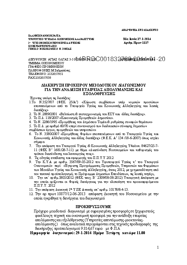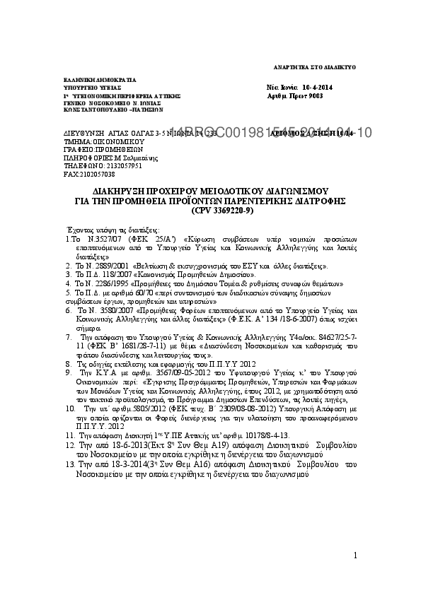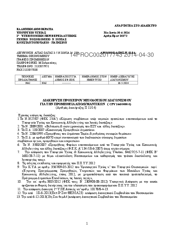 1. Διακήρυξη ανοικτού δημόσιου διαγωνισμού με αρ 4/13 για την προμήθεια αντιδραστηρίων για την εξακρίβωση της ομάδας αίματος (με και χωρίς παραχώρηση συνοδού εξοπλισμού )