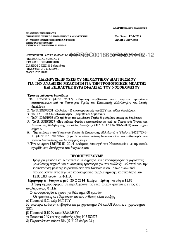 6. Διακήρυξη πρόχειρου μειοδοτικού διαγωνισμού με αρ Δ/ξης Π 4/14 για την ανάδειξη μελετητή για την τροποποίηση μελέτης κια επίβλεψης πυρασφάλειας του Νοσοκομείου