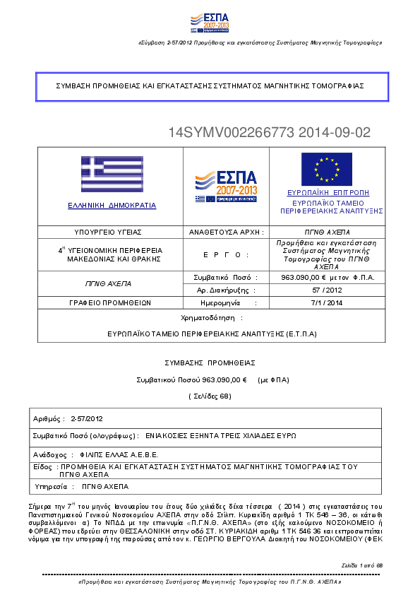 10. Προμήθεια και εγκατάσταση Συστήματος Μαγνητικής Τομογραφίας του ΠΓΝΘ ΑΧΕΠΑ