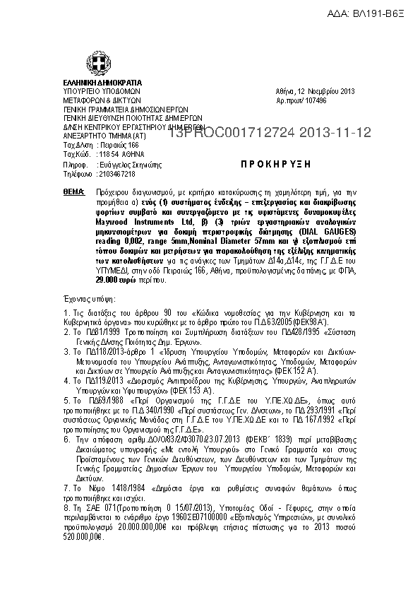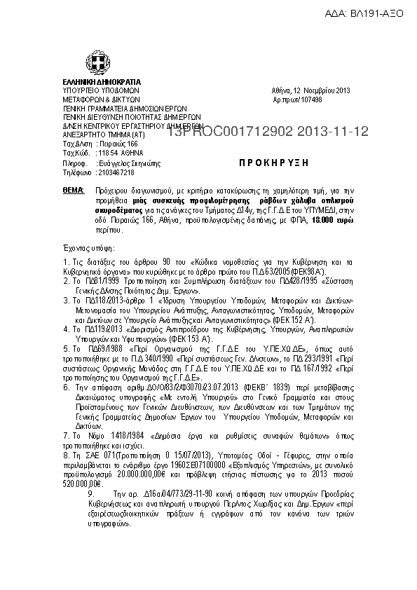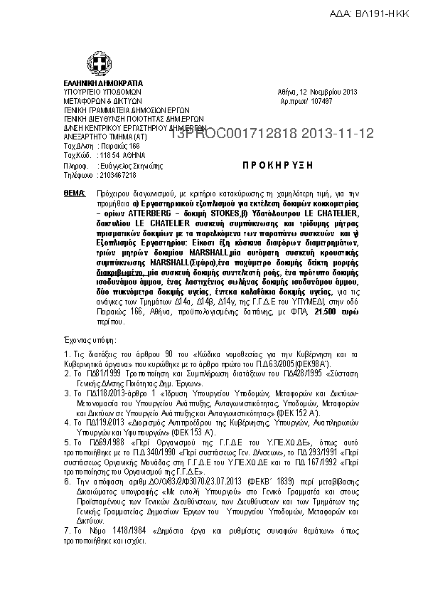 7. Πρόχειρου διαγωνισμού, με κριτήριο κατακύρωσης τη χαμηλότερη τιμή, για την προμήθεια μιάς συσκευής προφιλομέτρησης ράβδων χάλυβα οπλισμούσκυροδέματος για τις ανάγκες του Τμήματος Δ14γ, της Γ.Γ.Δ.Ε του ΥΠΥΜΕΔΙ, στην οδό Πειραιώς 166, Αθήν...