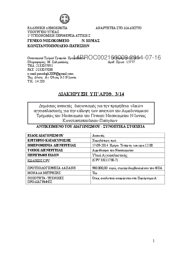 7. Διακήρυξη ανοικτού δημόσιου διαγωνισμού με αρ 3/14 για την προμήθεια υλικών αγγειοπλαστικής
