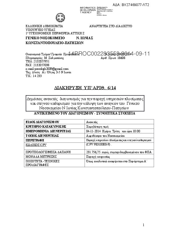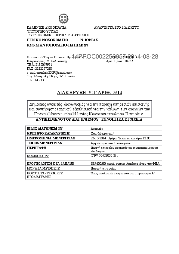 9. Δ/ξη ανοικτού δημόσιου δ/σμού αρ 5/14 για την παροχή υπηρεσιών συντήρησης ιατρικού εξοπλισμού