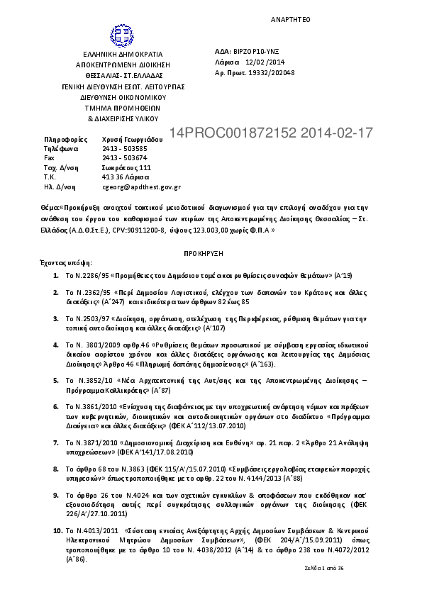 2. Προκήρυξη ανοιχτού τακτικού μειοδοτικού διαγωνισμού για την επιλογή αναδόχου παροχής υπηρεσιών καθαρισμού των κτιρίων της Αποκεντρωμένης Διοίκησης Θεσσαλίας – Στ. Ελλάδας (Α.Δ.Θ.Στ.Ε.), CPV:90911200-8, ύψους 123.003,00 χωρίς Φ.Π.Α
