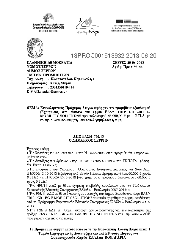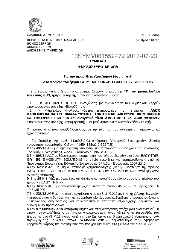 3. Σύμβαση για την προμήθεια του εξοπλισμού (Equipment) στο πλαίσιο του έργου EASY TRIP : GR