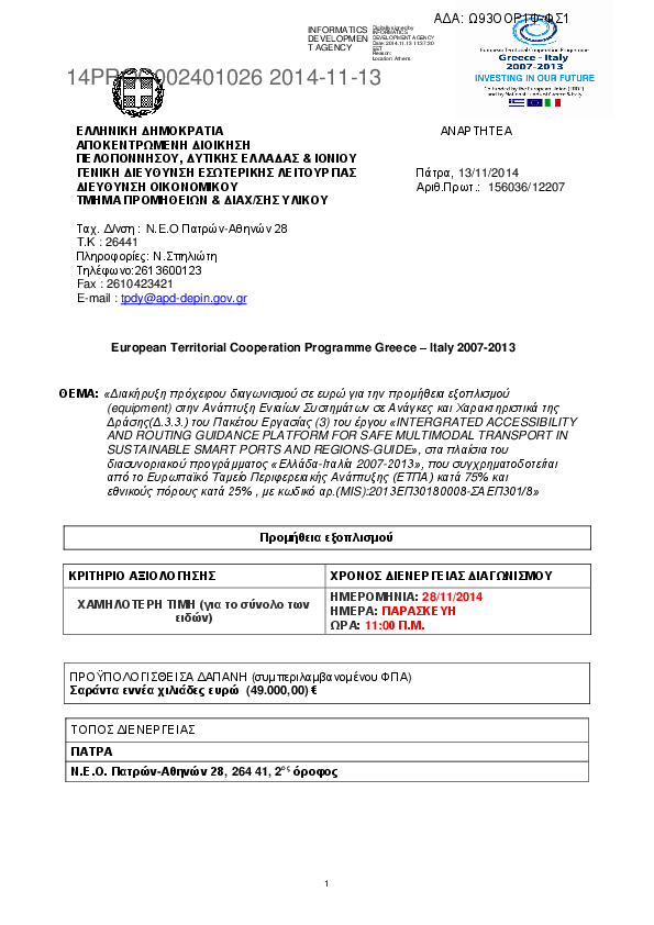2. Διακήρυξη πρόχ.διαγ. σε ευρώ για την προμήθεια εξοπλισμού (equipment) έργου GUIDEPORT