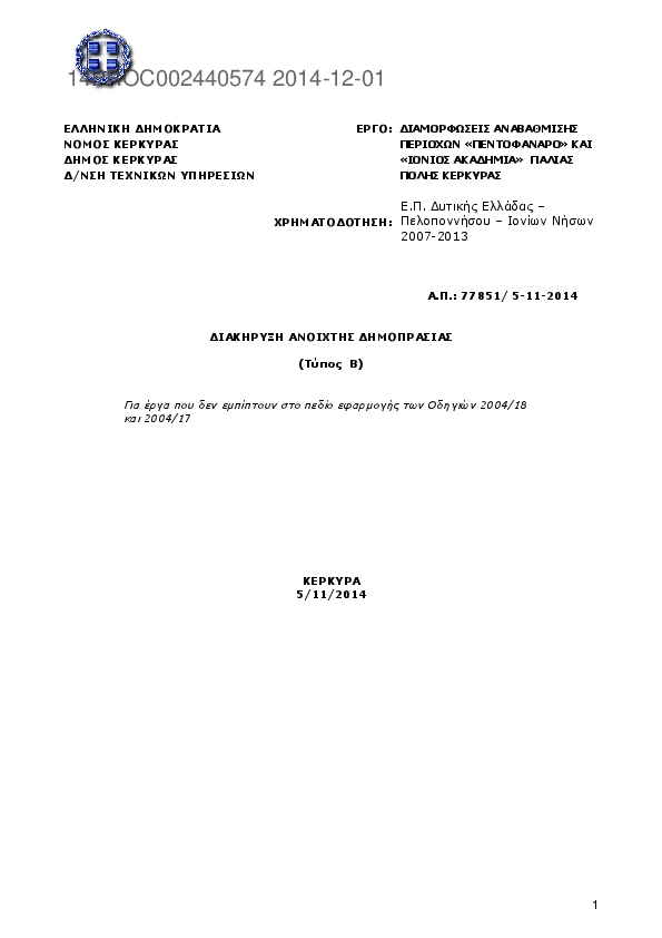 5. ΔΙΑΚΗΡΥΞΗ "ΔΙΑΜΟΡΦΩΣΕΙΣ ΑΝΑΒΑΘΜΙΣΗΣ ΠΕΡΙΟΧΩΝ«ΠΕΝΤΟΦΑΝΑΡΟ» ΚΑΙ «ΙΟΝΙΟΣ ΑΚΑΔΗΜΙΑ»ΠΑΛΙΑΣ ΠΟΛΗΣ ΚΕΡΚΥΡΑΣ"