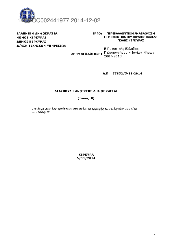 6. ΔΙΑΚΗΡΥΞΗ ΔΗΜΟΠΡΑΣΙΑΣ: "ΠΕΡΙΒΑΛΛΟΝΤΙΚΗ ΑΝΑΒΑΘΜΙΣΗ ΠΕΡΙΟΧΗΣ ΙΟΝΙΟΥ ΒΟΥΛΗΣ ΠΑΛΙΑΣ ΠΟΛΗΣ ΚΕΡΚΥΡΑΣ"