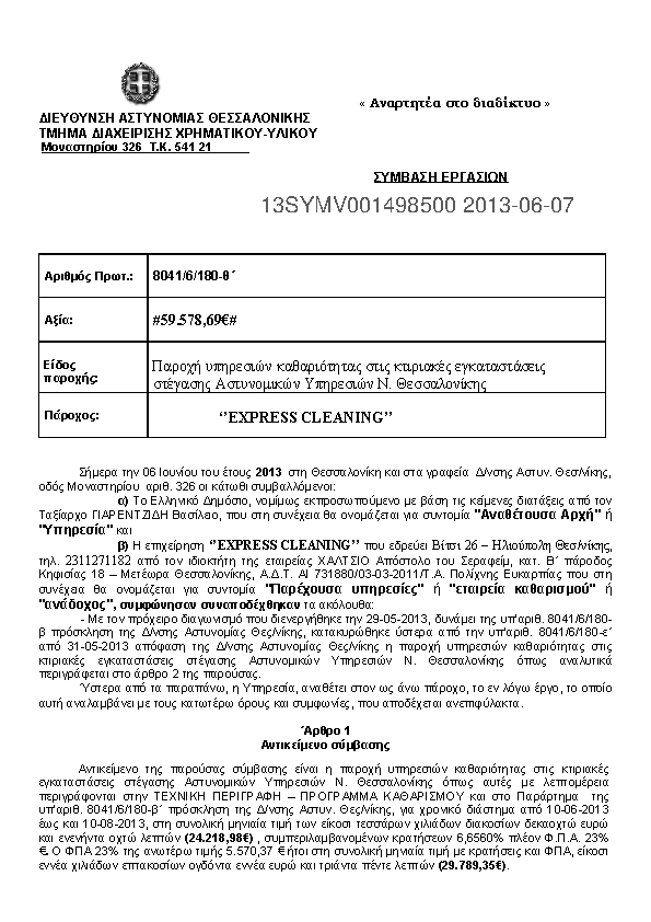 2. ΑΝΟΙΚΤΟΣ ΔΙΑΓΩΝΙΣΜΟΣ ΜΕ ΚΡΙΤΗΡΙΟ ΚΑΤΑΚΥΡΩΣΗΣ ΤΗ ΧΑΜΗΛΟΤΕΡΗ ΤΙΜΗ ΣΕ ΕΥΡΩ ΓΙΑ ΤΗΝ ΠΑΡΟΧΗ ΥΠΗΡΕΣΙΩΝ ΚΑΘΑΡΙΟΤΗΤΑΣ ΣΤΙΣ ΚΤΙΡΙΑΚΕΣ ΕΓΚΑΤΑΣΤΑΣΕΙΣ ΣΤΕΓΑΣΗΣ ΤΩΝ ΑΣΤΥΝΟΜΙΚΩΝ ΥΠΗΡΕΣΙΩΝ ΤΗΣ ΓΕΝΙΚΗΣ ΑΣΤΥΝ.Δ/ΝΣΗΣ ΘΕΣ/ΝΙΚΗΣ ΕΤΟΥΣ 2014