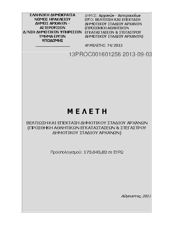 4. ΔΙΑΚΗΡΥΞΗΣ ΔΗΜΟΠΡΑΣΙΑΣ ΤΟΥ ΕΡΓΟΥ "ΒΕΛΤΙΩΣΗ ΚΑΙ ΕΠΕΚΤΑΣΗ ΔΗΜΟΤΙΚΟΥ ΣΤΑΔΙΟΥ ΑΡΧΑΝΩΝ (ΠΡΟΣΘΗΚΗ ΑΘΛΗΤΙΚΩΝ ΕΓΚΑΤΑΣΤΑΣΕΩΝ & ΣΤΕΓΑΣΤΡΟΥ ΔΗΜΟΤΙΚΟΥ ΣΤΑΔΙΟΥ ΑΡΧΑΝΩΝ)"