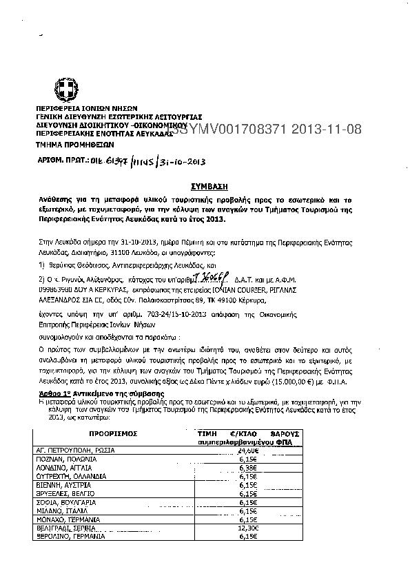 4. ΣΥΜΒΑΣΗ ΑΝΑΘΕΣΗΣ ΓΙΑ ΤΗ ΜΕΤΑΦΟΡΑ ΥΛΙΚΟΥ ΤΟΥΡΙΣΤΙΚΗΣ ΠΡΟΒΟΛΗΣ ΠΡΟΣ ΤΟ ΕΣΩΤΕΡΙΚΟ ΚΑΙ ΤΟ ΕΞΩΤΕΡΙΚΟ 2013